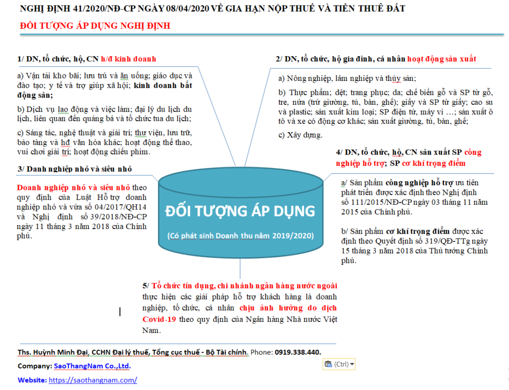 Dưới đây là quy định về gia hạn nộp thuế theo Nghị định 41/2020. Theo đó đối tượng được gia hạn nộp thuế sẽ được gia hạn 05 tháng và phải nộp Giấy đề nghị gia hạn theo tờ khai thuế tháng/quý hoặc trước ngày 30/7/2020. Tiền thuê đất gia hạn đến 31/5/2020/không phải 31/5/2010 (văn bản đính chính 132/CP-KTTH ngày 10/4/2020)